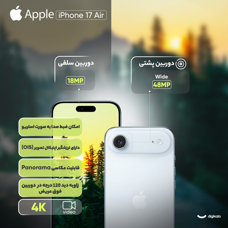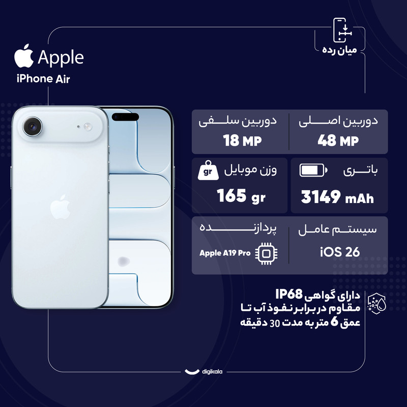 آیفون Air نسل تازهای از گوشیهای اپل است که میان نسخههای پایه و مدلهای حرفهای Pro قرار میگیرد و تجربهای متفاوت از طراحی باریک و سبک را در کنار توان سختافزاری قدرتمند ارائه میدهد. این دستگاه با بدنهای از جنس تیتانیوم و شیشه مات مقاوم ساخته شده و علاوه بر ظاهری لوکس، در برابر فشار و خط و خش نیز دوام بالایی دارد. اپل برای نمایشگر، پنل ۶.۵ اینچی Super Retina XDR با فناوری LTPO OLED را انتخاب کرده که وضوح بینقص، روشنایی بیش از ۳۰۰۰ نیت و نرخ نوسازی ۱۲۰ هرتز را در اختیار کاربر میگذارد؛ بنابراین چه در تماشای محتوای HDR و چه در اجرای بازیها، تجربهای کاملاً روان و شفاف خواهید داشت. قلب تپنده آیفون Air تراشه A19 Pro است که بر پایه معماری ۳ نانومتری طراحی شده و عملکردی نزدیک به نسخههای پرو اپل ارائه میدهد. این تراشه به لطف موتور عصبی پیشرفته، امکان استفاده از قابلیتهای Apple Intelligence را فراهم کرده است. در بخش دوربین، سنسور ۴۸ مگاپیکسلی Fusion با پردازش محاسباتی پیشرفته، تصاویر و ویدئوهایی با جزئیات بالا و دامنه دینامیکی وسیع ثبت میکند. فیلمبرداری 4K با Dolby Vision نیز آن را به گزینهای جذاب برای تولیدکنندگان محتوا بدل کرده است. اپل با طراحی بهینه، عمر باتری بیش از یک روز را تضمین کرده و پشتیبانی از شارژ سریع و MagSafe را نیز در نظر گرفته است. پشتیبانی از 5G، وایفای ۷ و بلوتوث ۶ هم سرعت و پایداری ارتباطات را تضمین میکند. در مجموع، آیفون Air انتخابی مناسب برای کسانی است که به دنبال ترکیب سبکی، زیبایی و قدرت هستند؛ گوشیای که مرز میان مدلهای معمولی و حرفهای اپل را کمرنگ میکند